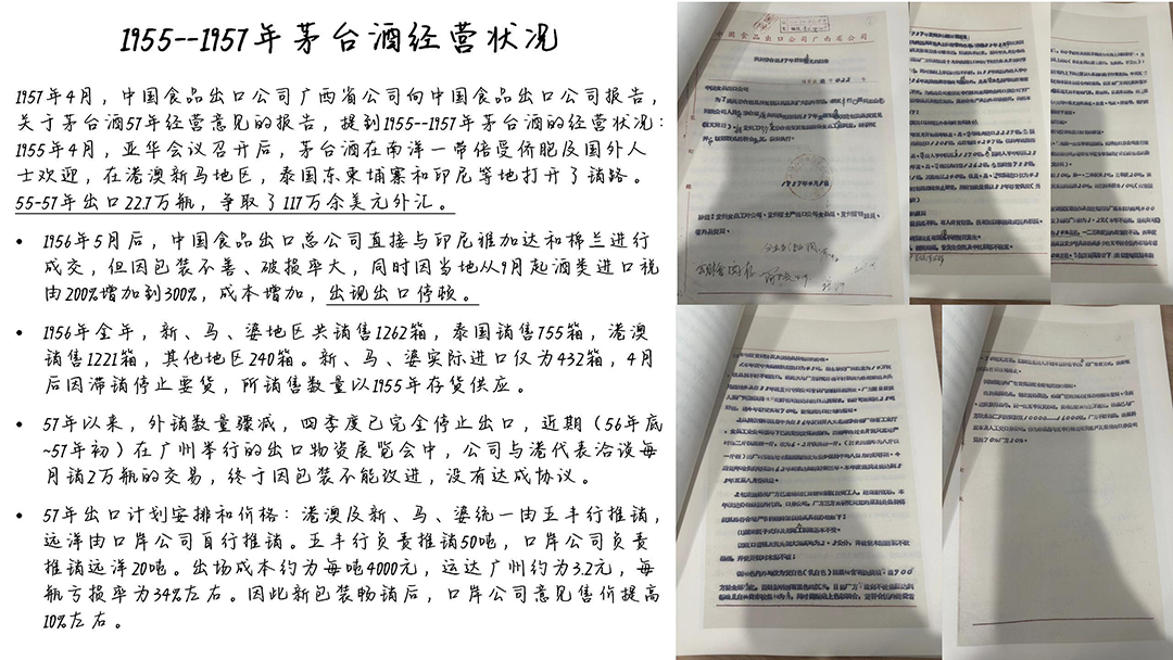 1957年4月,中国食品出口公司广西省公司《关于茅台酒1957年经营意见的报告》称:1955年4月,亚非会议召开后,茅台酒在南洋一带倍受侨胞及国外人士欢迎,在港澳新马地区,泰国、柬埔寨和印尼等地打开了销路。1955-1957年间,茅台共出口22.7万瓶,创汇117万美元,成为当时外汇储备的重要来源之一。