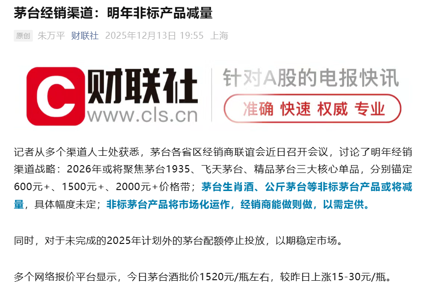 其中,2026年或将聚焦茅台1935、飞天茅台、精品茅台三大核心单品,分别锚定600元+、1500元+、2000元+价格带;